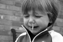 On the other hand, a 1-year-old with a runny nose needs constant attention and help with wiping it, keeping her little face and hands clean, and keeping snot off of everything she touches. She needs a teacher or caregiver in close proximity at all times to wipe and help with hand washing and to keep an eye out for snot fangs. Heaven forbid she sneezes and it lets loose.