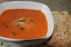 Strain through sieve to eliminate seeds and skin. Press with back of spatula to get all liquid to be used as soup. (Note: I might skip this next time by blanching the skin off and removing seeds by thumb prior to cooking). Far easier and feels like there is less tossing away.