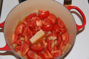 Heat oil over medium heat and add onions and smashed garlic. Begin to sweat and turn down heat accordingly, so as not to brown. Add some S & P at every step. Add tomatoes, sugar and water. Stir, add S & P and add piece of rind, thyme and coriander.