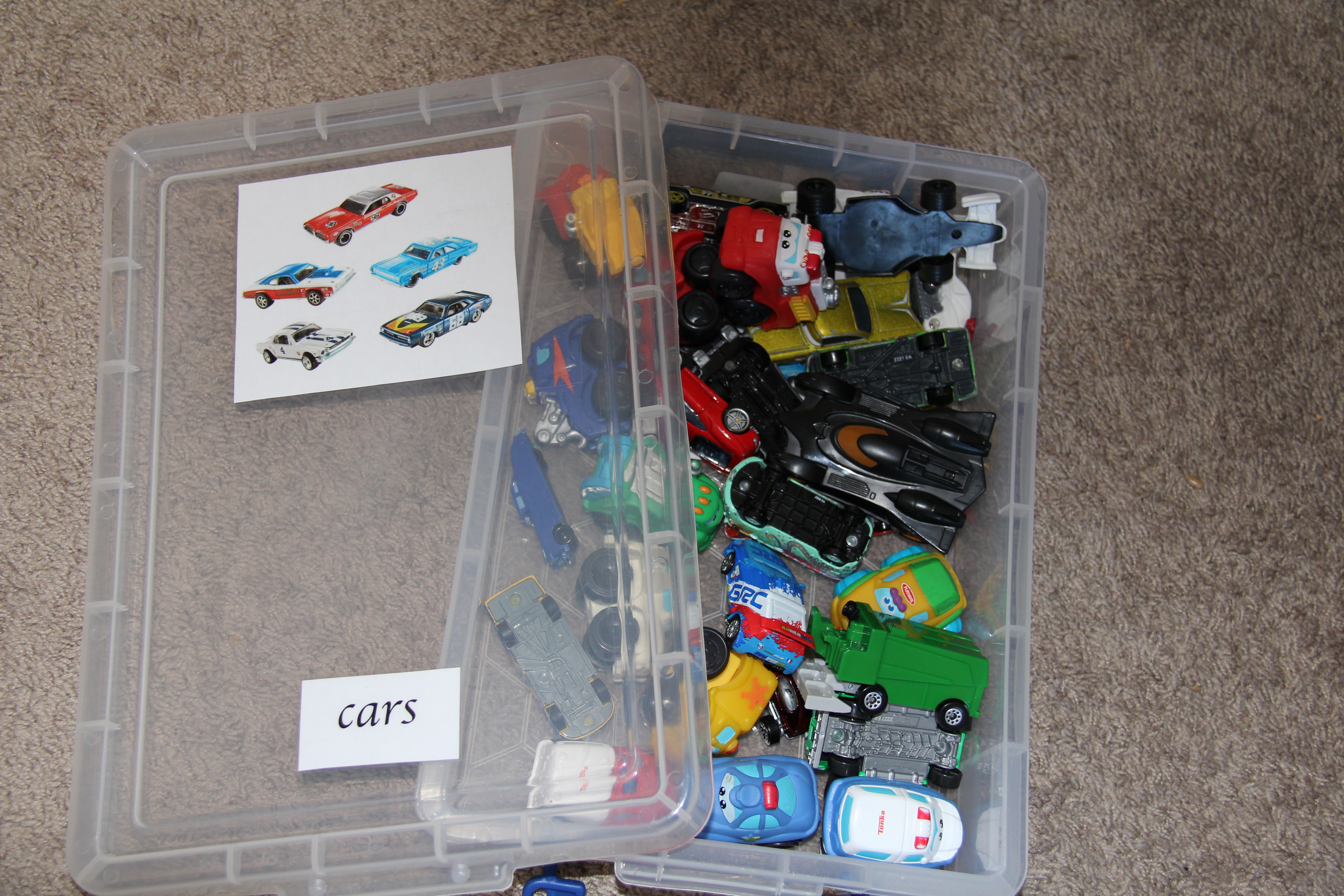 Sort toys of one type (cars or dolls, for example) and put them in a bin labeled with the word for them, as well as a photo. You can simply print these off and use packing tape or other clear adhesive, to cover them and keep them from being peeled off. Alternatively, laminate your labels so they can be easily moved or reused.